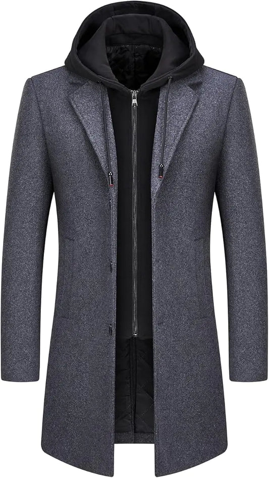 Lamgool Mens Winter Long Coat Wool Blend Single Breasted Overcoat With Removable Hood(GreyM)